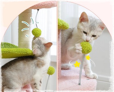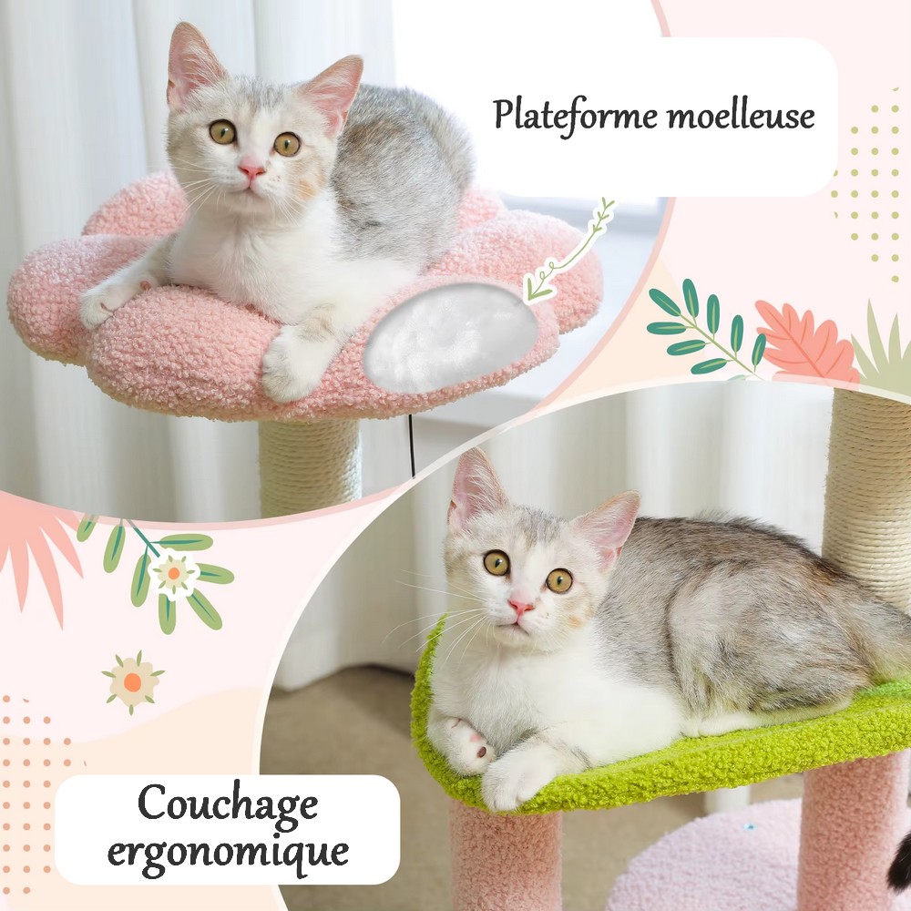 Avec plusieurs poteaux à gratter en corde de sisal, un griffoit intégré, une plateforme de repos en hauteur, une balle pompon, vos félins vont se régaler.